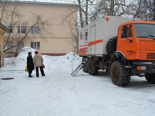 Работа передвижного флюорографа Кировского областного диагностического центра во дворе Госпиталя для ветеранов войн.