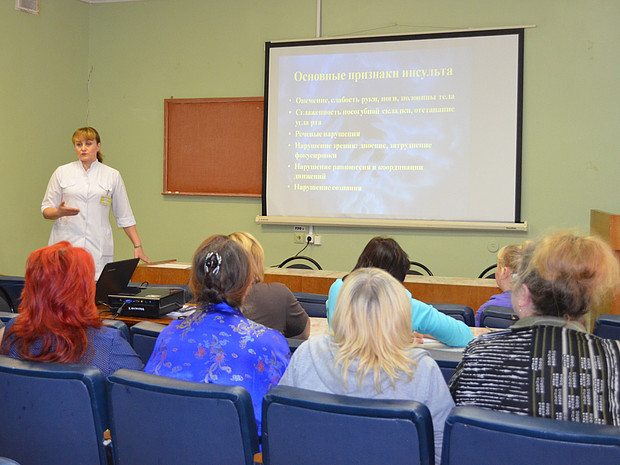 На занятиях школы специалист рассказывает, что такое инсульт, какую помощь необходимо оказать своему родственнику во время инсульта, о профилактике инсульта среди молодого населения и о возвращении пациента в социум.
