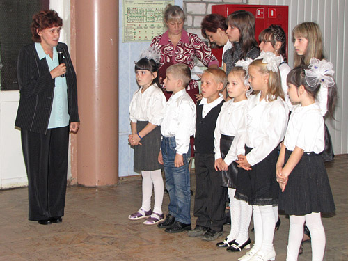 Первоклассников поздравляет их первая учительница.