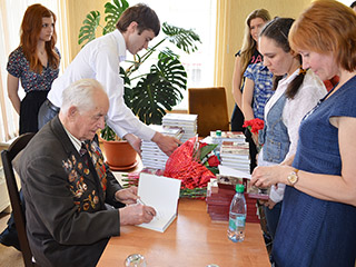 Будущие медицинские работники поблагодарили Михаила Николаевича за интересный рассказ и подарили музыкальный номер в подарок. Также на встрече звучали стихи о войне в исполнении студентов. В конце встречи ветеран подписал всем участникам экземпляр своей книги в подарок.