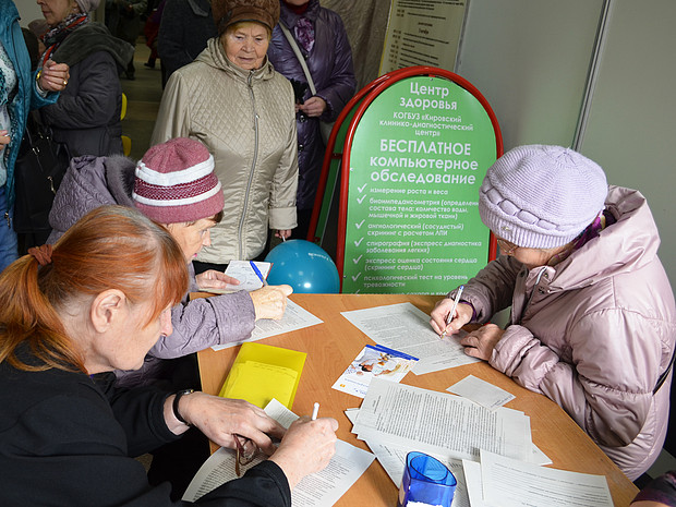Традиционно в выставке принимают участие медицинские работники. Специалисты Центра профессиональной патологии: психотерапевт, офтальмолог и дерматолог ведут бесплатный прием, кроме того для кировчан работает передвижной флюорограф. В этом году особой популярностью у жителей и гостей Кирова пользуется комплексное обследование Центра здоровья Кировского клинико-диагностического центра. Обратившимся измеряют рост и вес, окружность талии, они проходят психологические тесты на стрессоустойчивость, спирографию (экспресс-диагностика работы легких) и биоимпедансметрию (определение состава тела), ЭКГ. Так же в обследование входит определение сахара и холестерина в крови. В завершении по результатам осмотра пациенты получают консультацию врача-терапевта Центра здоровья.