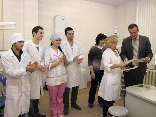 Главный врач Слободской центральной районной больницы им.ак.А.Н.Бакулева А.В.Черняев вручает почетную грамоту ассистенту кафедры стоматологии Кировской ГМА С.Н.Громовой.